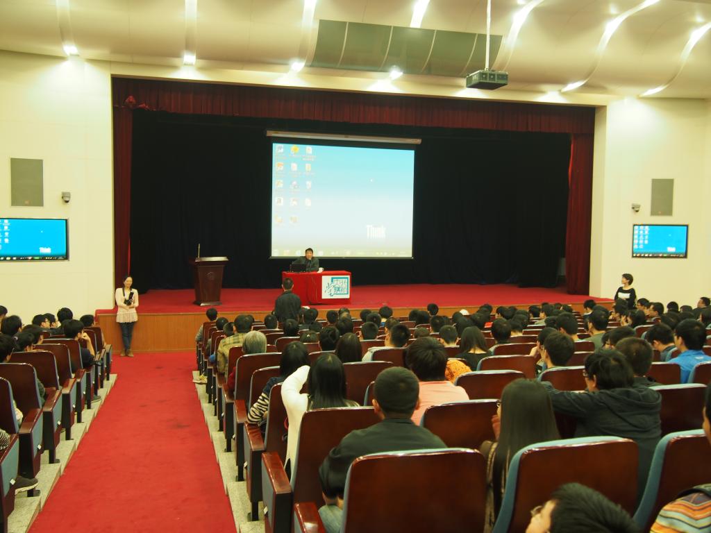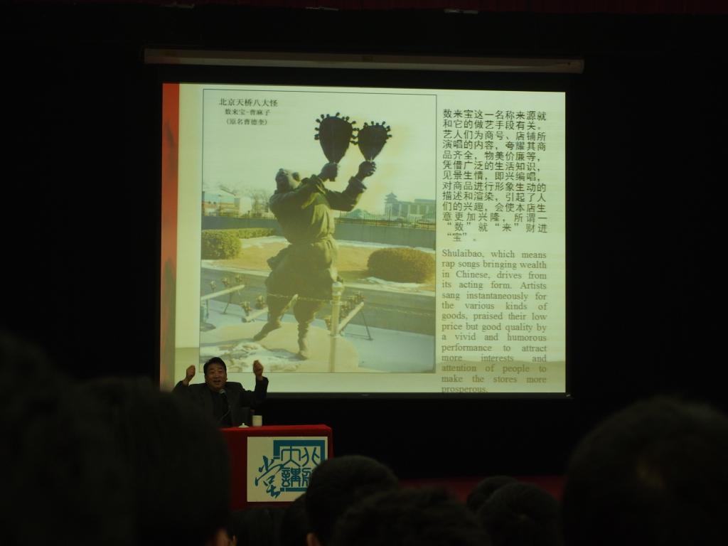 在讲座中,姜昆老师回顾了中国曲艺悠久的发展历史,从远古的《诗经》,到说唱角,再到曲艺艺术的前身——变文,一直讲到近现代的北京天桥,八大怪,数来宝,莲花落等,并通过幻灯片展示了古代艺人的辛酸;接着介绍了曲艺丰富多彩的演绎形式,包括相声、评书、快板、单弦、京韵大鼓、琴书、评弹、二人转等等,大大丰富了同学们的眼界。整个演讲过程中,姜昆老师边介绍边自演,其诙谐幽默的语言和生动的肢体动作,使得学术交流厅内掌声不断。
