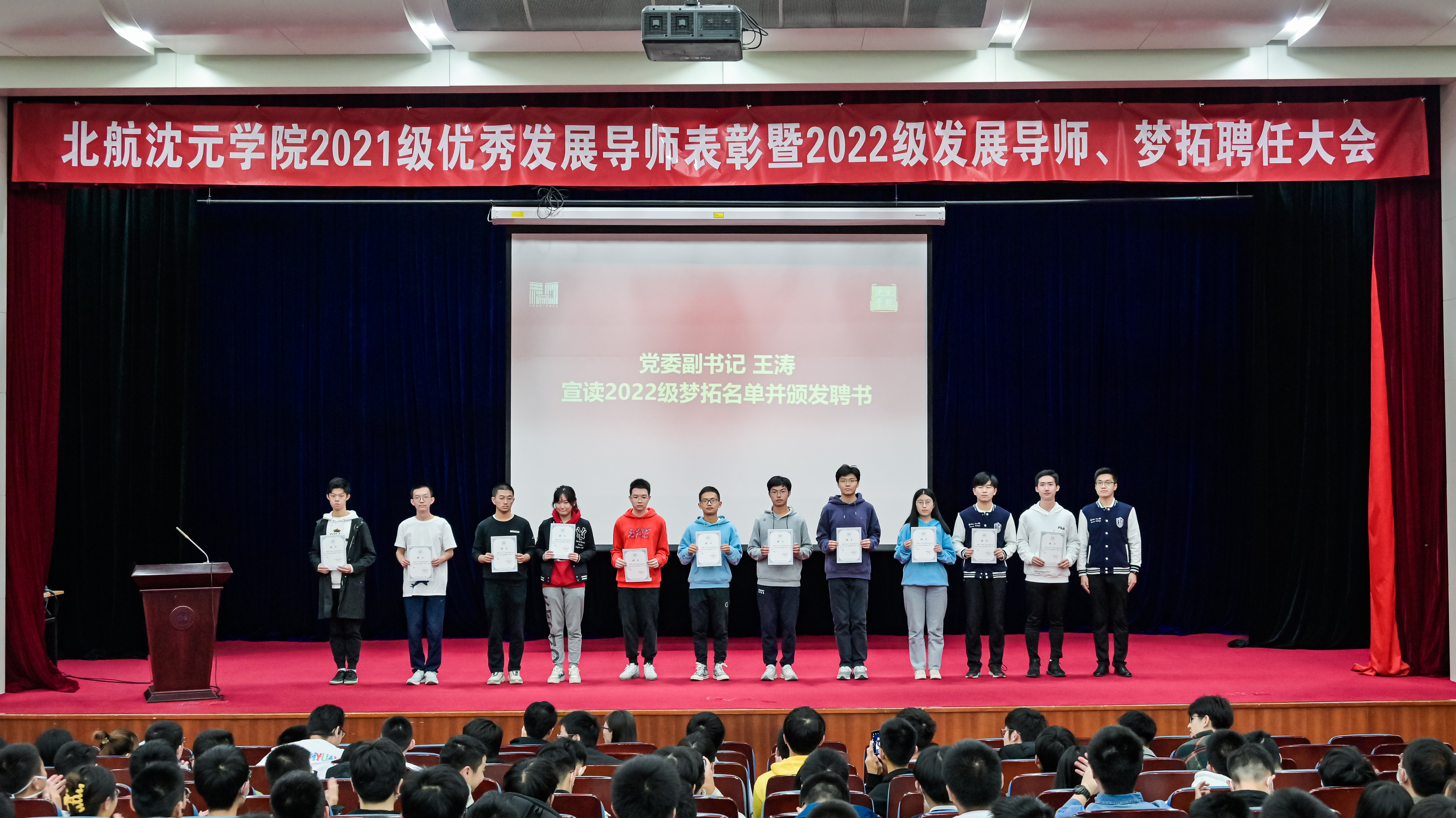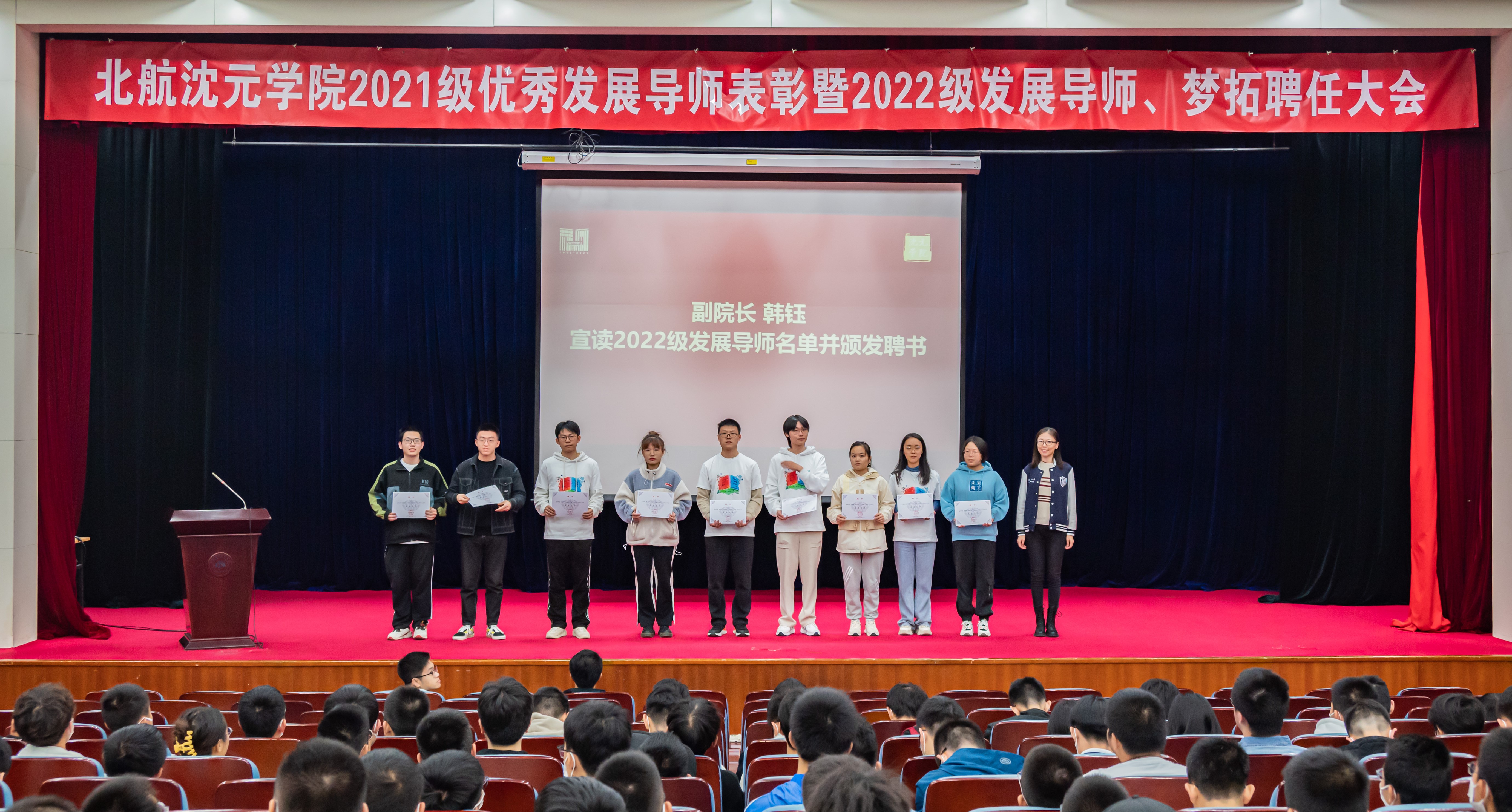 2022年10月12日下午,公司在学术交流厅召开2021级优秀发展导师表彰暨2022级发展导师、梦拓聘任大会。公司负责人和辅导员,2021级优秀发展导师代表,2022级新聘发展导师、梦拓,以及2022级全体本科新生共200余人参加大会。