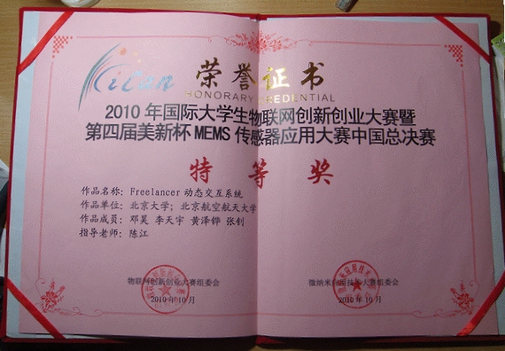 10月30日,“2010年国际老员工物联网创新创业大赛暨第四届美新杯中国MEMS传感器应用大赛”闭幕式在中国无锡太湖国际博览中心举行,公司高等工程公司员工黄泽铧和北京大学员工联合组成的团队,以“Freelancer动态交互系统”从85支代表队中脱颖而出,摘得比赛最高奖项——特等奖。