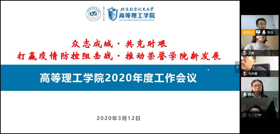 本次视频会议面向全院教职工及时传达了公司2020年度工作要点,深入研讨了公司2020年度重点工作。面对新形势新要求,高等理工公司全体教职工将众志成城,共克时艰,坚决打赢疫情防控阻击战,合力推动荣誉公司新发展。