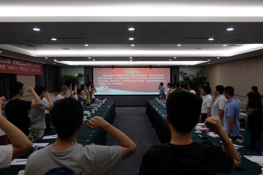 仪式结束后,高博班党建工作站和青年人才党建工作站举行了第一次共建活动——喜迎建党98周年暨“不忘初心·牢记使命”主题党日活动。活动中,师生党员集体重温入党誓词、交流心得体会、学习理论书籍。活动最后,教师党员向高博班员工党员赠送书籍《梁家河》。主题党日活动进一步加深了参会师生党员对“不忘初心、牢记使命”精神实质和思想内涵的理解,为做新时代的追梦人积蓄了力量。
