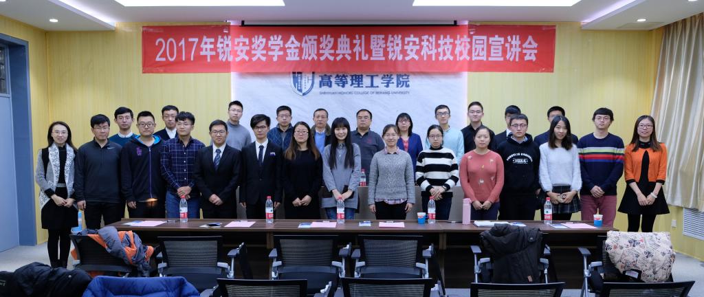 12月13日,2017年锐安奖学金颁奖典礼暨北京锐安科技有限公司校园宣讲会在高等理工公司报告厅举行。北京锐安科技有限公司研究院经理万月亮,技术合作经理贾晓芸、王玥玥,人力资源招聘经理陈超,高等理工公司经理马齐爽、直属党支部书记陈新、党政办主任韩钰、分团委书记徐墨客等出席典礼。