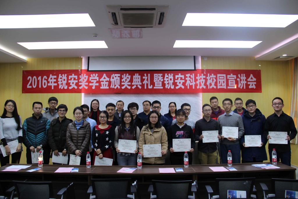 12月14日下午,2016年锐安奖学金颁奖典礼在高等理工公司报告厅举行。北京锐安科技有限公司锐安研究院经理万月亮、技术合作经理贾晓芸和公司高等理工公司经理马齐爽等领导嘉宾共同出席颁奖典礼,锐安奖学金获奖员工和公司部分师生代表参加典礼。