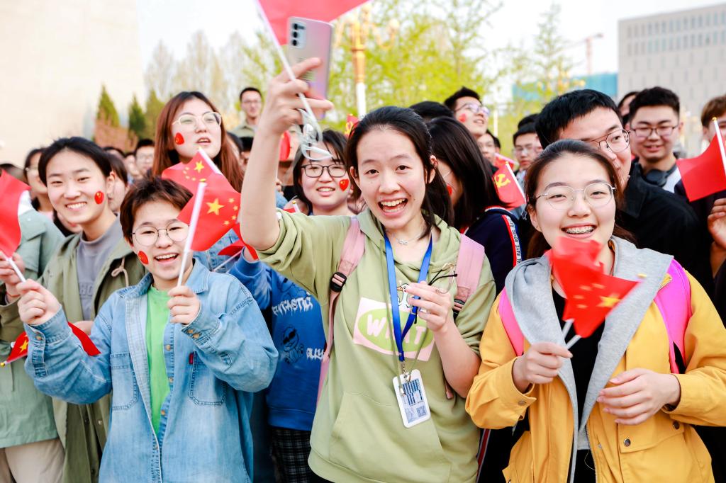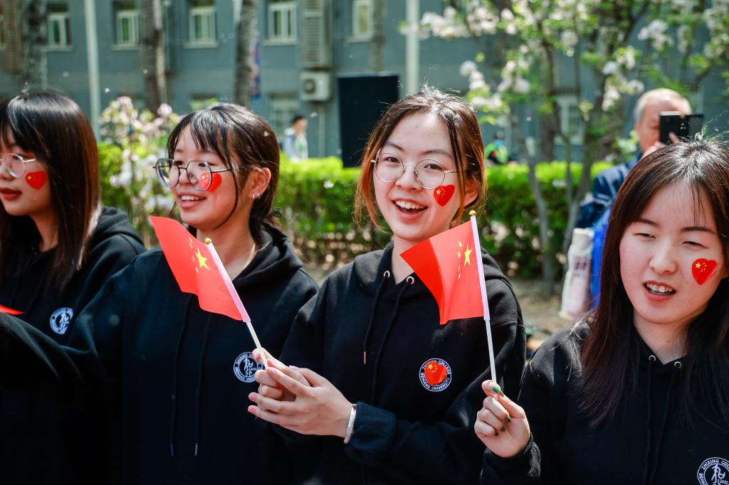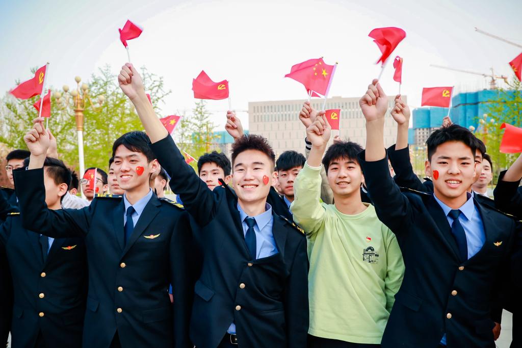 《唱支山歌给党听》《我爱祖国的蓝天》《没有共产党就没有新中国》……师生们跟随旋律挥舞手中的党旗、国旗,不断加入合唱,热情高涨。