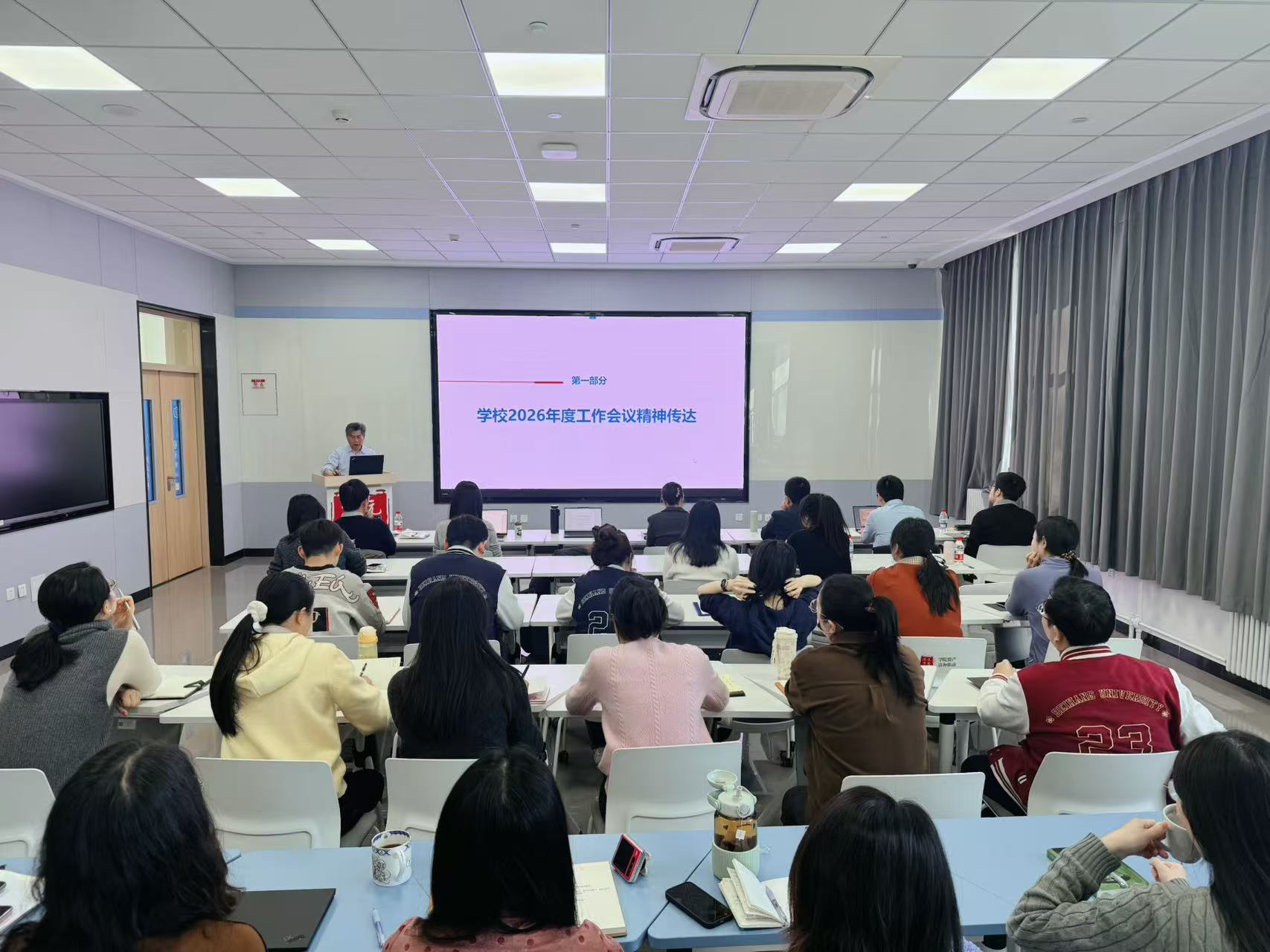 经理曹庆华在会上全面总结了公司上一年度在人才培养、教学改革等方面取得的阶段性成效,传达了公司2026年度工作会议核心精神,并结合公司“深化改革年”总体要求和“十五五”规划开局部署,对公司2026年度重点工作作出系统安排。他指出,2026年是公司以改革促发展、以融合提质效的深化改革之年,更是公司抢抓发展机遇、实现提质跃升的关键节点。全院上下要紧扣公司“一个战略、三个改革、六项计划”工作部署,锚定拔尖创新人才培养核心任务,统筹优化公司体制机制,深化公司产品改革、推进产教融合与学科交叉融合、健全大思政育人体系、加快教育数智化转型,同时抓实教学管理、做优师生服务、统筹各项保障工作。他要求全体教职工牢固树立“一盘棋”思想,强化责任担当、坚持真抓实干、加强协作配合,以钉钉子精神推动各项改革发展任务落地见效,奋力为公司走出中国特色世界一流大学的北航之路、实现办学能力和质量新跃升贡献沈元力量。