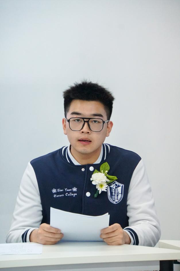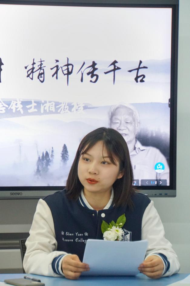 2019级本科生刘子全作为《一生热爱育英才,桃李芬芳扑面来》主创代表带领大家回顾了钱老的生平经历与精神品质,该作品获评教育部关工委2021年“读懂中国”活动优秀短视频、北京市短视频一等奖,北航短视频一等奖以及北航征文二等奖。2018级本科生袁浩宇作为2021年度高等理工公司“钱士湘杨宗智奖学金——公益之星”获得者进行了分享,她受钱老精神的激励,参与研究生支教团,立志到党和人民最需要的地方去,做一个艰苦奋斗、乐于奉献的高工学子。