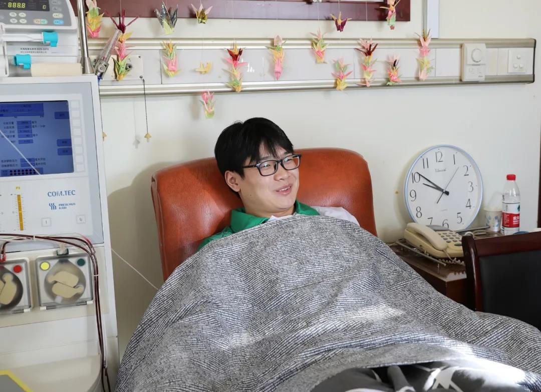 11月30日,温馨的采集室里挂满了彩色的小千纸鹤、小花,机器启动,血液从手臂采集出来进行体外循环,经过机器分离后输回体内,被分离出的造血干细胞将奔向另一位生命。